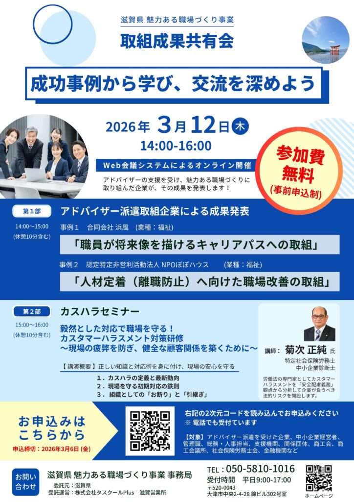 | 内容 | 第1部:成果発表 「キャリアパスへの取組」「人材定着への職場改善」の事例紹介 第2部:カスハラセミナー 「毅然とした対応で職場を守る!カスタマーハラスメント対策研修」 講師:菊次 正純 氏(特定社会保険労務士・中小企業診断士) |